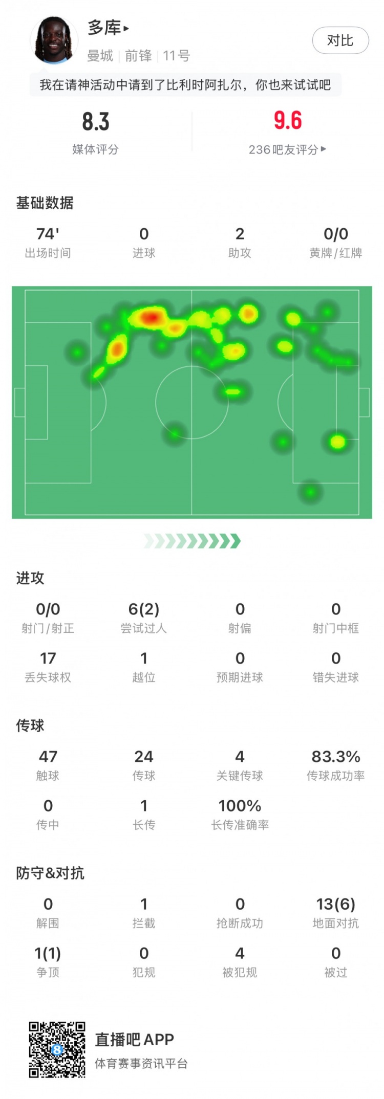 9月15日讯 英超曼市德比,曼城翼锋多库杆位出战,有2个助功 ,球员本场数据如下: