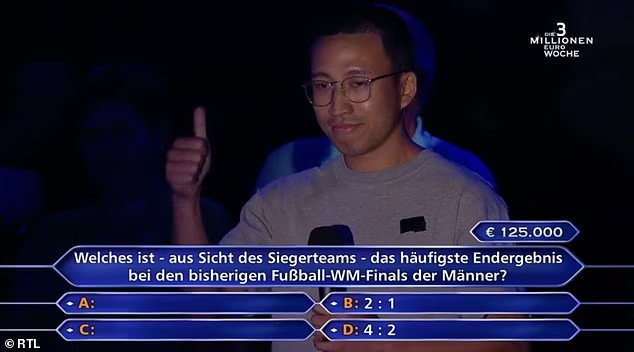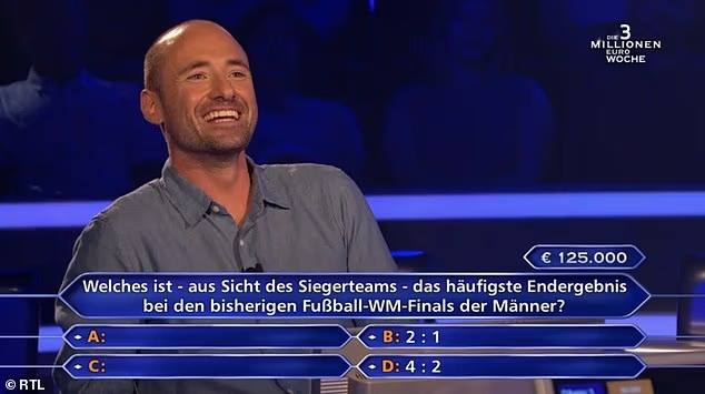 10月11日讯 在德国版的《谁想成为百万富翁》智力竞赛节目中,一位参赛者没能回答对世界杯赛 总决赛 的比分,错失12.5万欧元(约103万人民币)奖金。